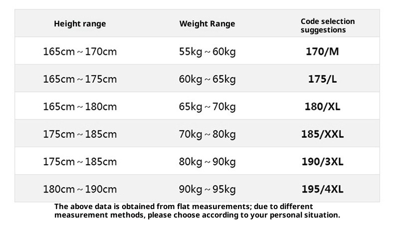 Size: M [47.50 kg-55.00 kg], L [55.00 kg-62.50 kg], XL [62.50 kg-70.00 kg], 2XL [70.00 kg-77.50 kg], 3XL [77.50 kg-85.00 kg], 4XL [85.00 kg-92.50 kg], 5XL [92.50 kg-100.00 kg]], 6XL [100.00 kg-110.00 kg]]